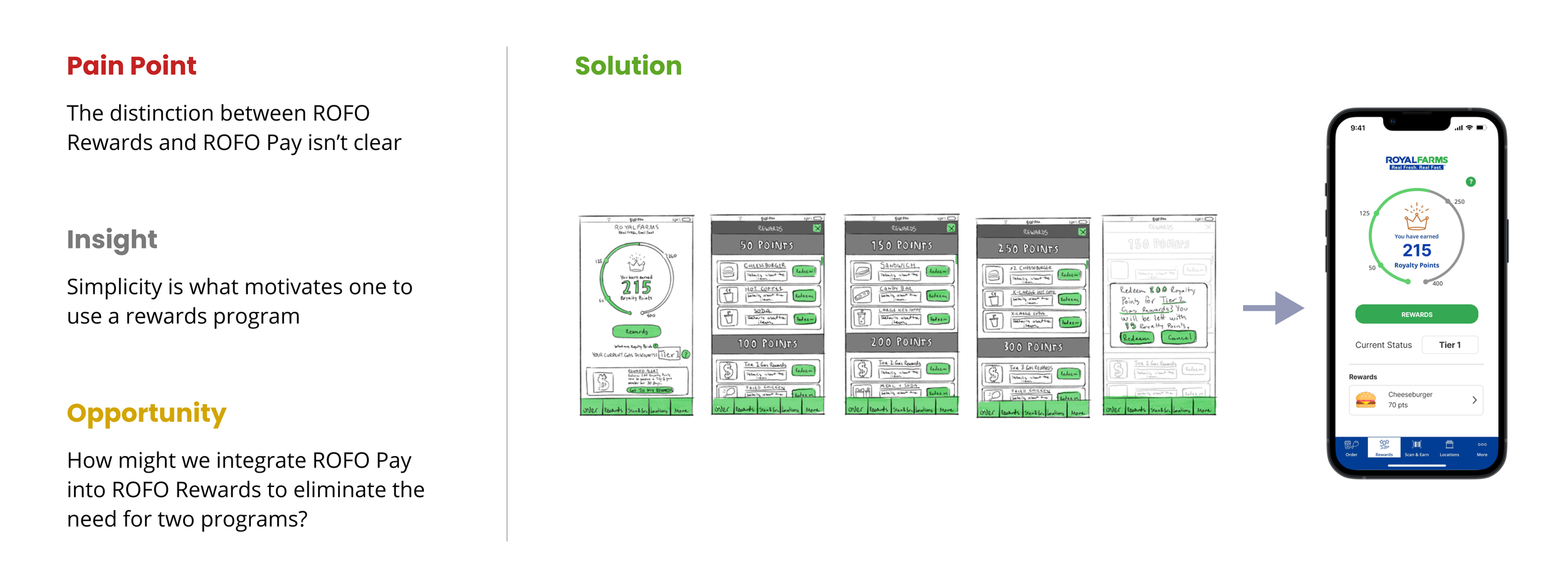 ROFO Rewards is a customer loyalty program offered by Royal Farms, a chain of convenience stores, with many locations featuring gas stations. Royal Farms aimed to address customers' challenges in understanding and using the program by simplifying and enhancing the experience for members, with the goal of attracting new customers. I worked alongside a team of researchers to learn how the usability and comprehension of ROFO Rewards could be improved.